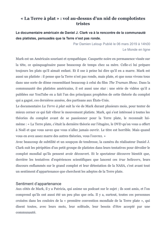 - l'information est tronquée (exemple de la vitesse du son ; exemple de l'accès limité au pôle sud qui n'est une preuve de rien car il peut y avoir de nombreuses raisons pratiques à cela) ou déformée (le trajet de l'avion n'est montré que sur une carte de la terre plate) et permet ainsi d'arriver à des conclusions erronée.