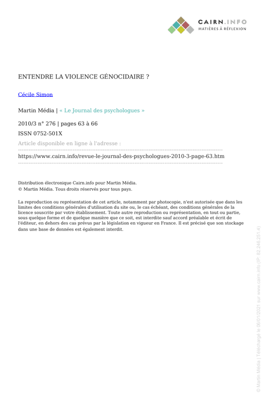 Simon, Cécile. « Entendre la violence génocidaire ? », Le Journal des psychologues, vol. 276, no. 3, 2010, pp. 63-66.