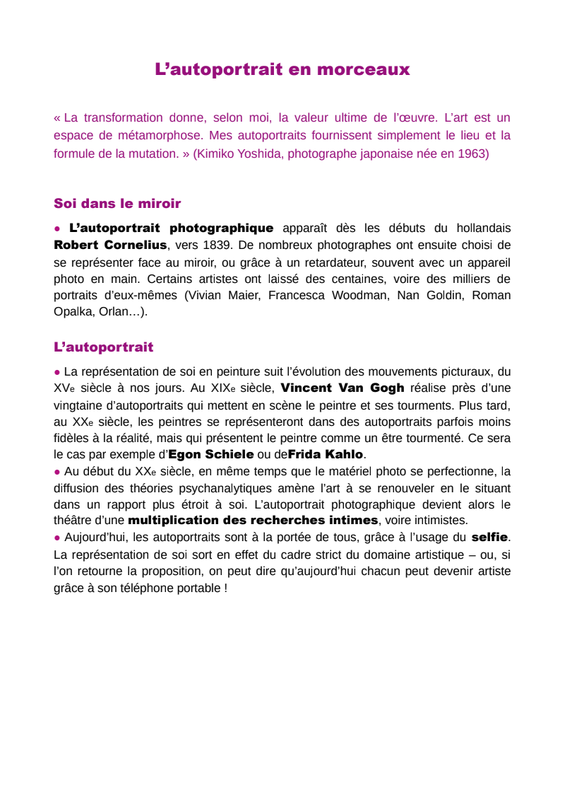 => le morcellement du portrait par la technique du collage met en évidence la multiplicité du moi dans le regard de l'autre qui use de points de vue différents pour regarder le visage du personnage.