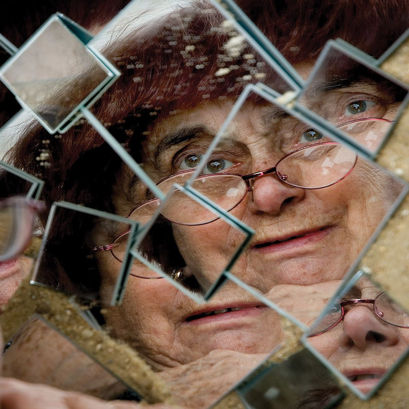 => le regard du photographe est mis en abyme par le renvoi de l'image dans le miroir. Les différents miroirs provoquent à nouveau un morcellement du visage, symbole de l'identité qui se décline donc sous de multiples facettes.